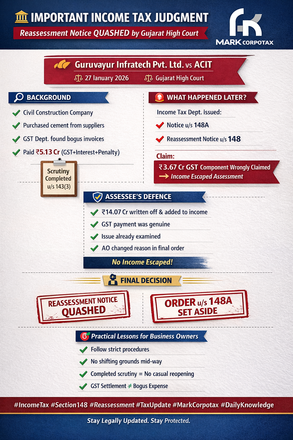 In a significant judgment dated 27 January 2026, the Gujarat High Court quashed a reassessment notice issued under Sections 148A and 148 of the Income Tax Act in the case of Guruvayur Infratech Pvt. Ltd. vs ACIT (AY 2021-22).